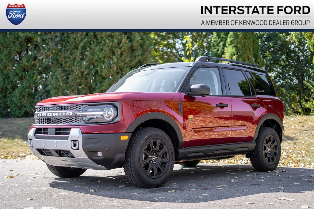 Rear View Camera, Back Up Alarm System, Parking Sensors, Touch Screen, Handsfree Calling/Bluetooth, USB/AUX Ports, Pre-Collision Assist, Blind Spot Monitoring System, Lane-Keeping System Alert, Lane Keeping System, Adaptive Cruise Control, Alloy wheels, Equipment Group 400A, Heated front seats, Heated steering wheel, Memory seat, Steering wheel mounted audio controls, SYNC 4 w/Enhanced Voice Recognition, Wheels: 17" Matte Black-Painted Aluminum. 2025 Ford Bronco Sport 4D Sport Utility Badlands 80 Ruby Red Metallic Tinted Clearcoat EcoBoost 2.0L I4 GTDi DOHC Turbocharged VCT 4WD 21/27 City/Highway MPG Price includes: Although every reasonable effort has been made to ensure the accuracy of the information contained on this site, absolute accuracy cannot be guaranteed. All vehicles are subject to prior sale. Price does not include applicable tax, title, license, and a $387.00 documentation fee or other fees required by law, lending institutions, and/or lessors. Vehicles shown at different locations are not currently in our inventory (not in stock) but can be made available at our location within a reasonable time after your request. Listed APR, down payment, payments, incentives and other terms are estimates for example purposes only. The payment information provided here is not a commitment by any organization to provide credit, leases or other programs. Some customers may not qualify for listed programs.$1000 - Retail Bonus Cash. Exp. 09/30/2025