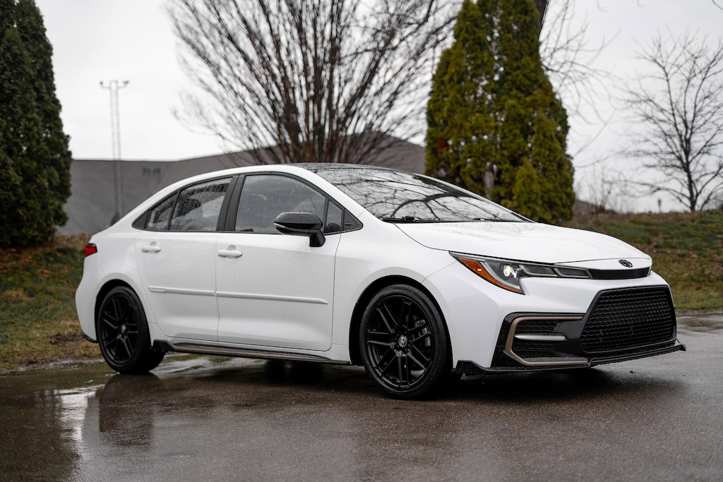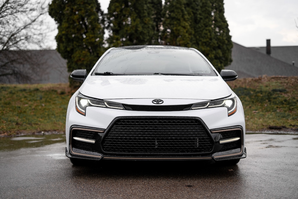 The exterior of the Corolla APEX SE exudes a bold and sporty presence, with its 18" Black Flow-Formed Aluminum wheels, body-color bumpers, and a sleek spoiler. The White paint finish adds a touch of elegance, while the automatic headlights and turn signal indicator mirrors provide enhanced visibility and safety.